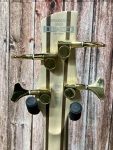 With the bass held in the playing position, there are three small knobs closest to the lower edge of the body. Directionally, from the lower bout towards the neck knobs are treble boost/cut, mid boost/cut, and bass boost/cut. There are two larger knobs above these, closer to the bridge. The knob closest to the neck controls volume, and the knob next to it is the pickup balancer control. There is a 3-way power tap switch next to the balancer knob. When the switch is in neck position, the humbuckers are tapped. When the switch is in center position, the humbuckers are in series. when the switch is in bridge position, the humbuckers are in power tap mode, which is tapped with additional low end added.